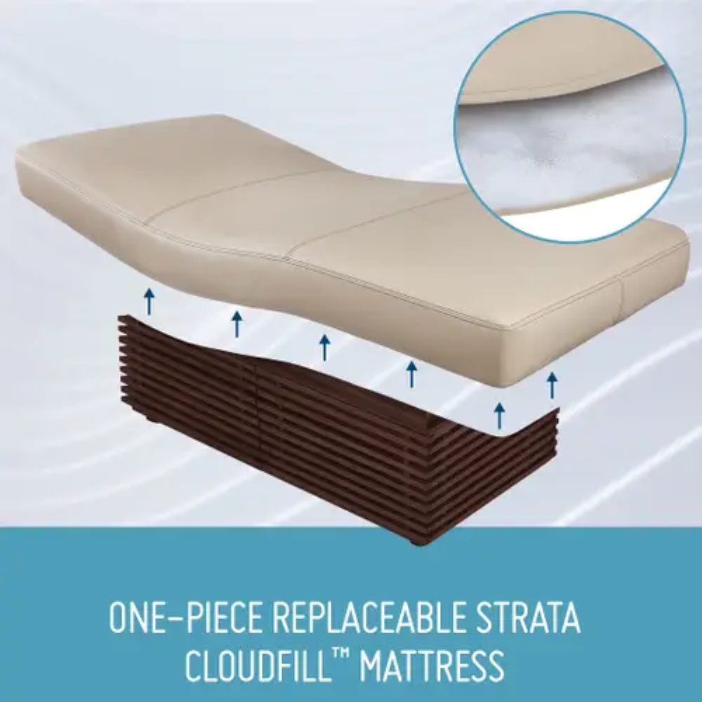 LEC is the only company to incorporate multi-density layering with memory foam and our proprietary Cloudfill™ spun polygel into its mattress designs for unsurpassed luxury. Craftsman hand-upholster the sumptuous 5.5”, 5-layer cushioning system with our new, medical grade+ Comfort-Flex™ PU fabric. Easily replaceable for extended table life. Strata Cloudfill mattresses now include EarthConnect™, the industry’s first grounding and EMF protection system.